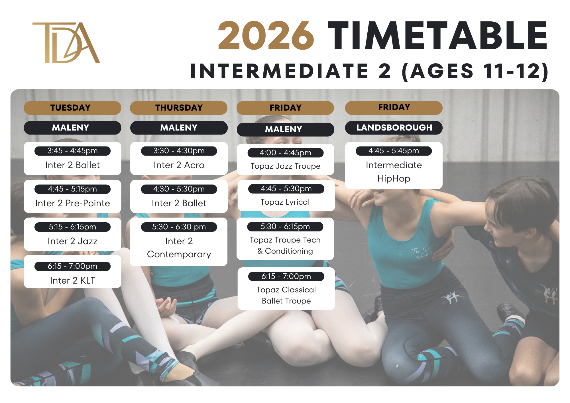 Ballet Students in grade 5 ballet will begin pre-pointe classes and have the opportunity to realise every ballerinas dream and begin pointe work. Intermediate Dancers also have the opportunity to become leaders in our TDA Family through our Student Teacher Program.